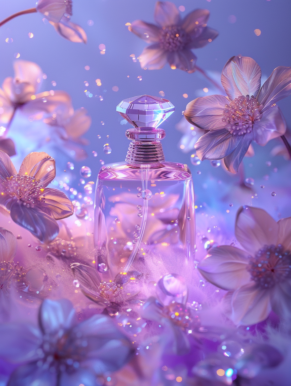 This piece was created by blending 3D modeling with digital generative tools. The perfume bottle was designed and rendered in 3D, with attention to glass refractions, crystal details, and the way light scatters through transparent surfaces. The surrounding flowers and atmosphere were then enriched with layered digital processes, giving them a soft, dreamlike quality that feels both real and surreal.